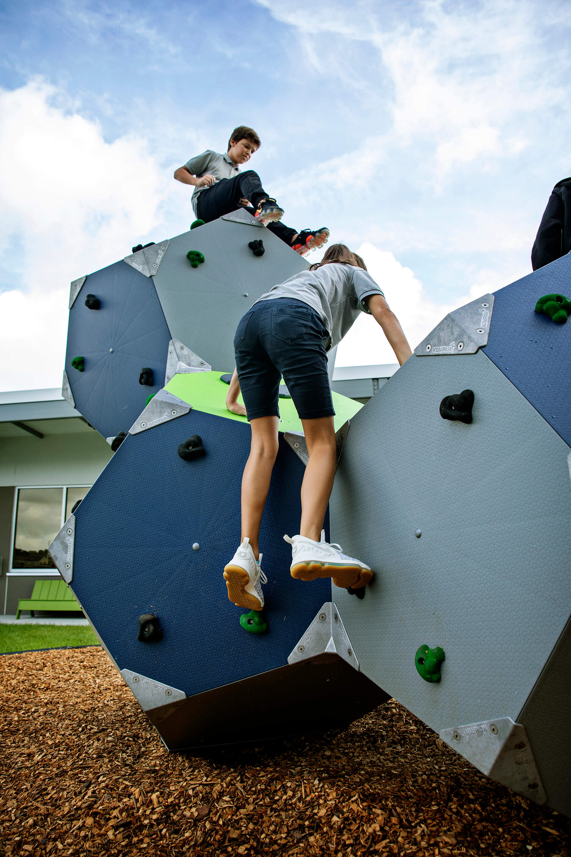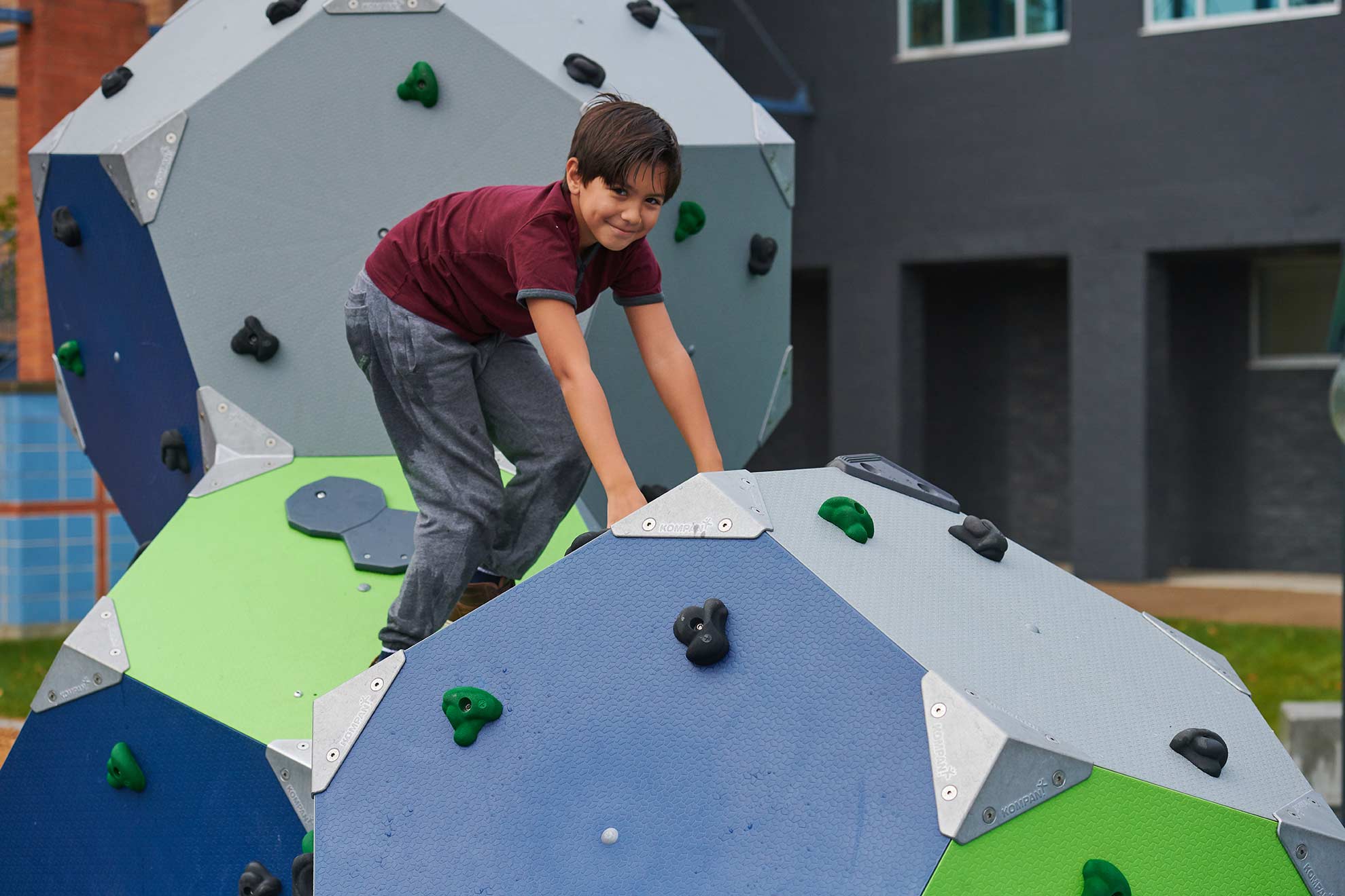 | - The iconic, geometric shaped blocks encourages climbing and meeting particularly for teenagers and older children. With its sculptural look and professional climbing grips, BLOQX™ invites scalable climbing challenges and games. The design allows room for socializing and exchange with its ridges and valleys. The possibility of climbing, crawling and balancing at your own speed makes the BLOQX™ a safe option for children at different climbing levels | The creation of new climbing routes and methods with friends or individually makes for hours of thrill and climbing play. The varied grip and panel positions help to develop muscle strength and motor skills: cross-body coordination, proprioception and spatial awareness, having a positive impact on concentration skills and social-emotional skills such as consideration, which is used when children climb and meet together on the BLOQX™. |