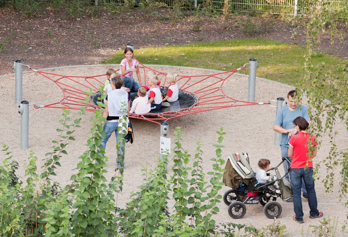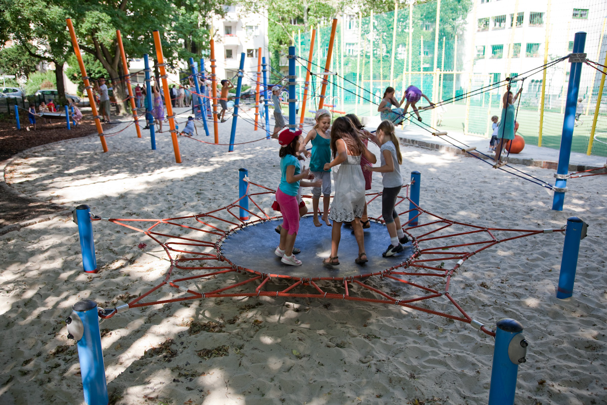 | - This bouncy horizontal membrane is a playground favourite. The outer ropes are bouncy and make a fine destination for balancing around the central membrane. Children can jump and bounce on the central membrane which helps build bone density as well as being great fun. When jumping, children train balance, rhythm and proprioception. These motor skills are crucial for navigating the world securely, judging distances, e.g. in traffic. The huge net is a gathering point, where children can lie, sit or stand, bounce one another by jumping. This trains social skills such as empathy as well as communication skills when adjusting behaviour to consider others. |