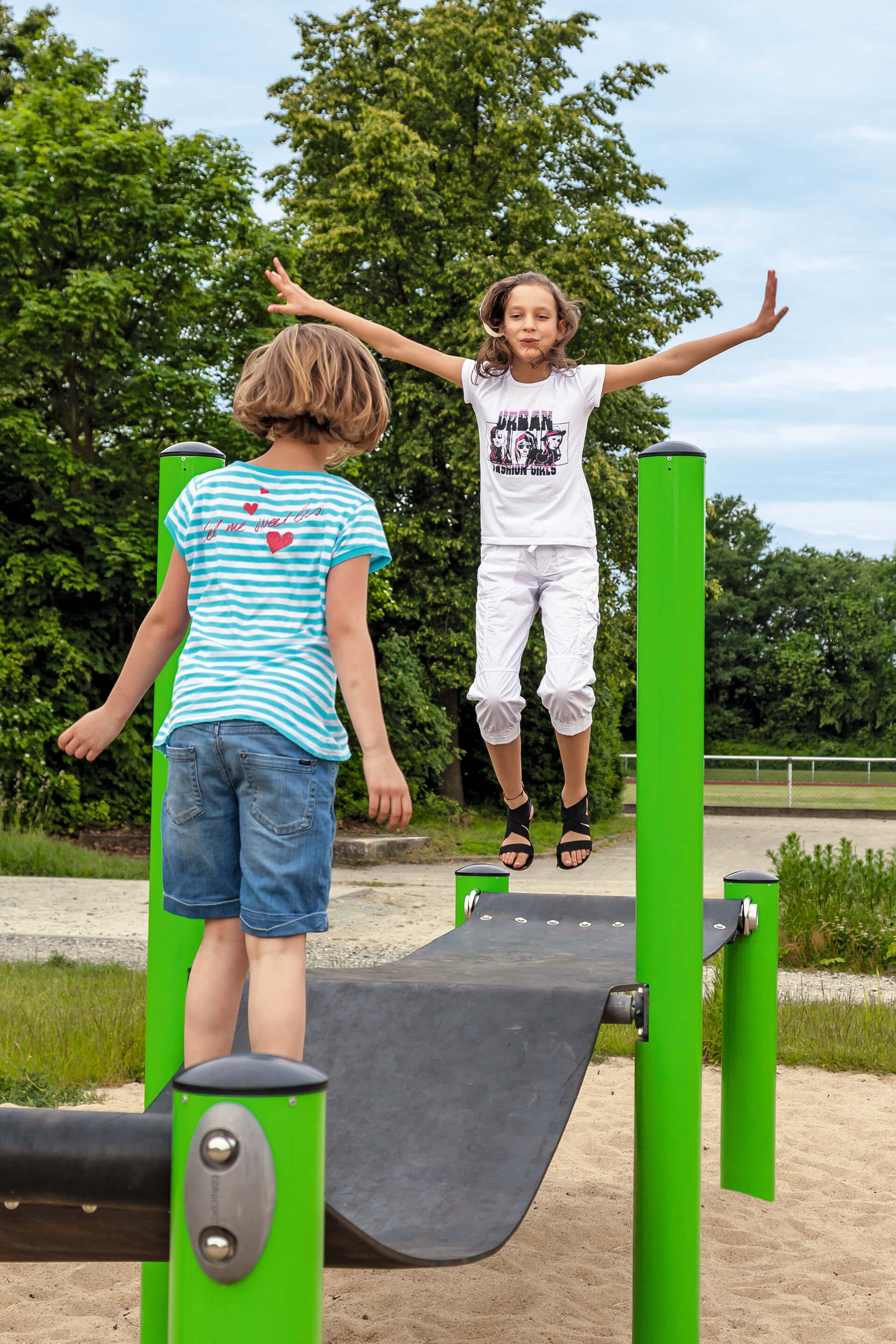 | - The Jumping Bridge is a responsive social or individual play event that will attract all children time and time again. Bouncing with others is a true challenge | when children find the rhythm of jumping in cooperation, they can catapult each other up in the air, which holds great attraction and evokes many laughs. As well as being lots of fun, the Jumping Bridge helps to develop important motor skills, such as balance and coordination. Bone density is built in childhood and weight bearing activities such as jumping are perfect in supporting that development. Through playing on the jumping bridge children's cooperation, negotiation and communication skills and challenged. |