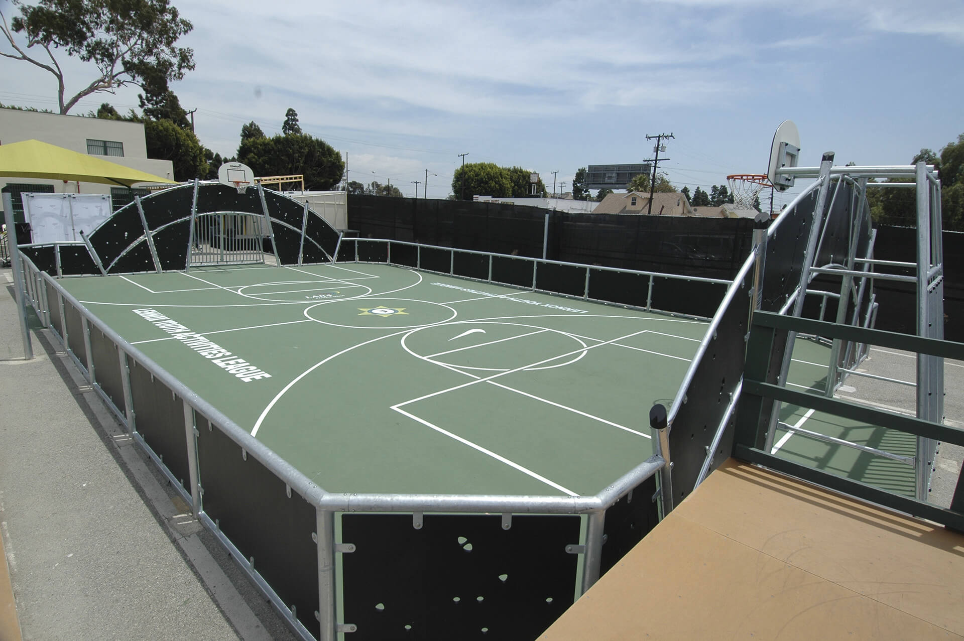 | - A multisport pitch includes two goals with built in basketball hoops and a height adjustable multisport net in the middle of the play area. The panels in the goal area have engraved sport motifs. The goals have removable anti-moped barriers for wheelchair access and the lower barriers have lower profile for grass edge protection with water drainage holes. The pitch is based on a modular system. The dimensions of the pitch can be customized according to individual requirements. The HD polyethylene panels can be supplied in different standard colors. The pitch can also be equipped with a number of additional activities. |