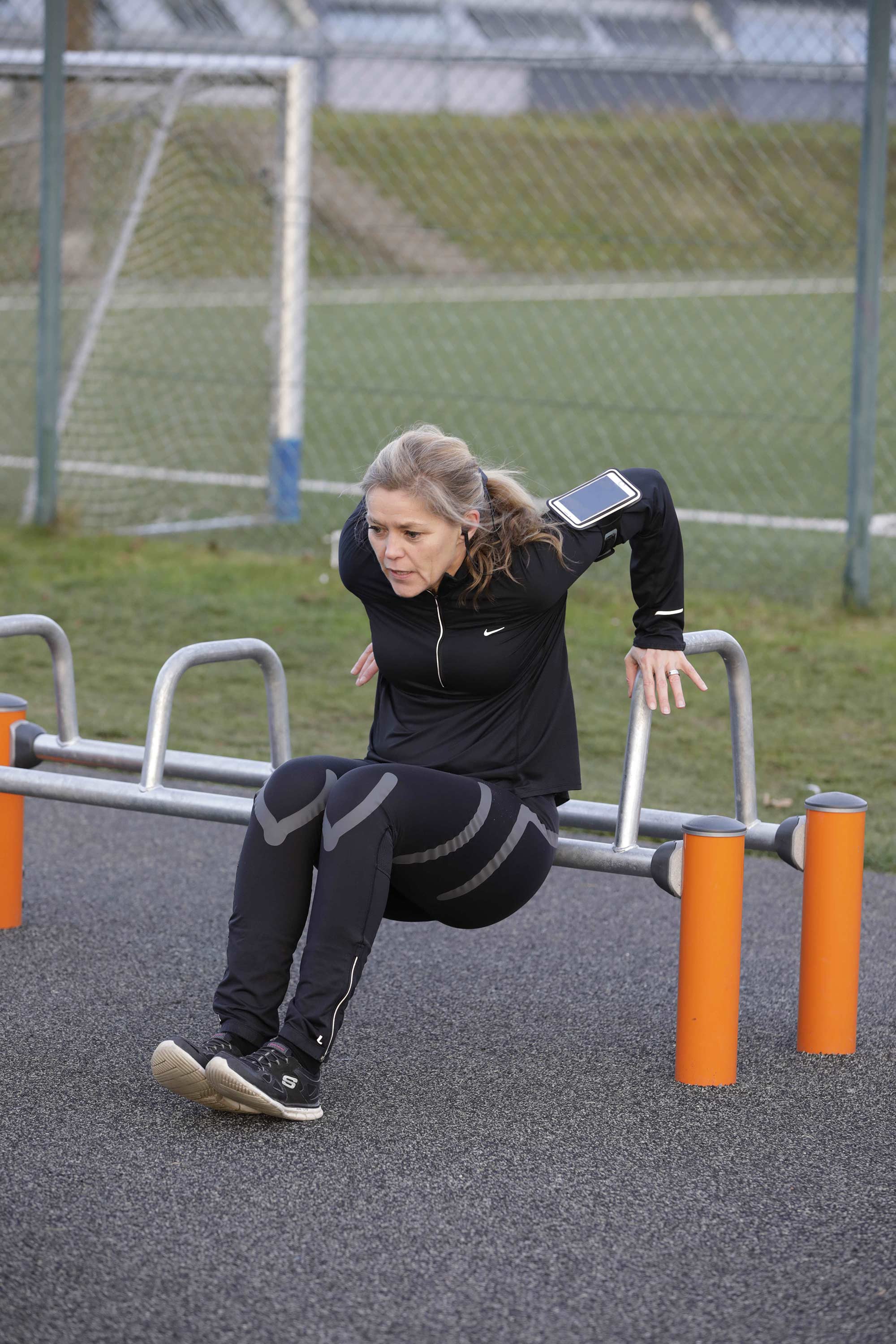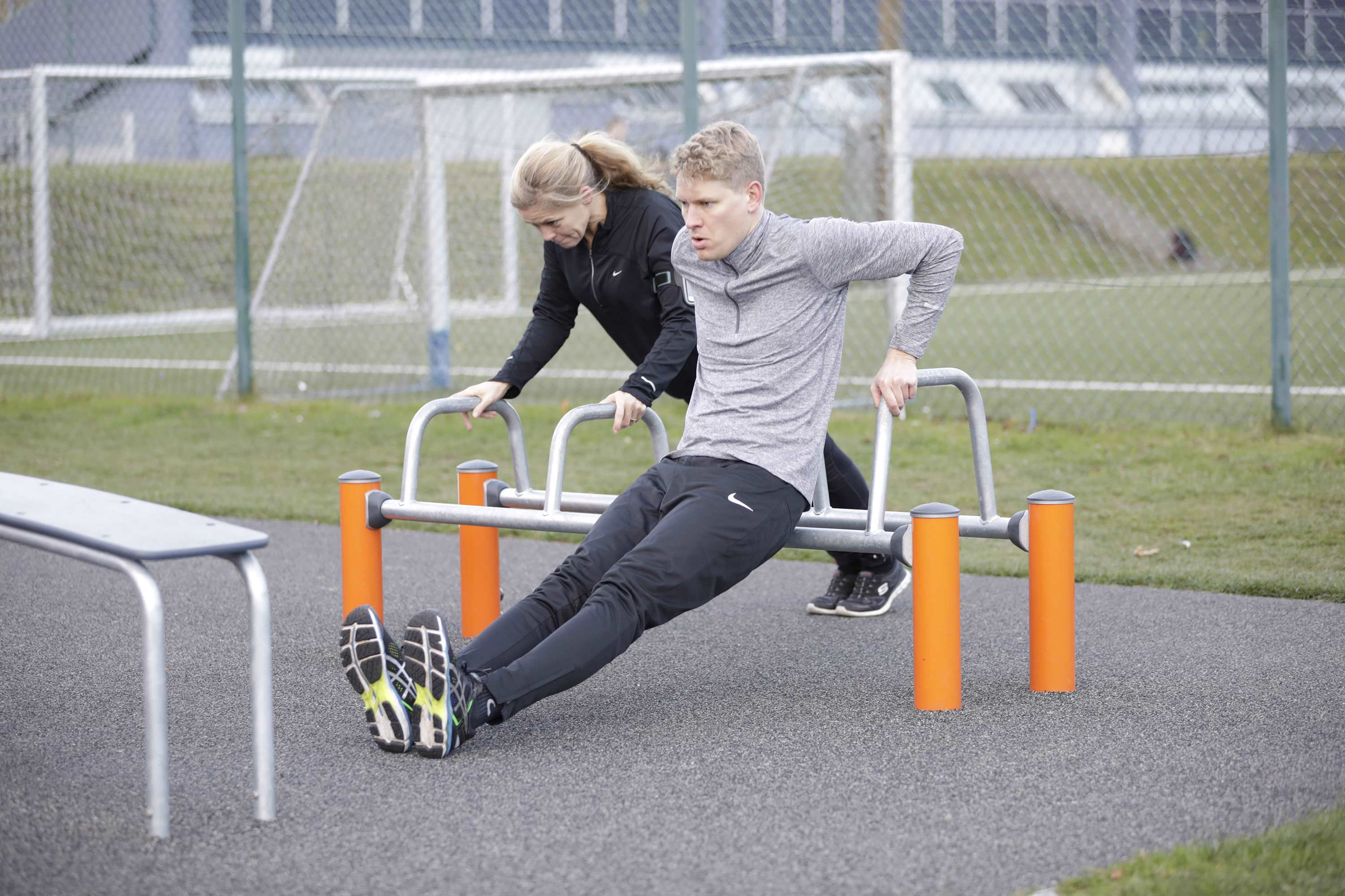 | - A row of parallel handle bars suitable for the more advanced hand balancing exercises such as hand stand push ups. Also perfect for dips, an ideal exercise for strengthening the chest, shoulder and arm muscles. Rounded corners makes it safe and simple for anyone to try exercises in which they try to swing their legs over the bar. The Dip Bench has a clear instruction sign showing the basic exercise and a QR code. By using the QR code users can connect to the KOMPAN fitness App, where they will find multiple exercises and workouts at every level. |